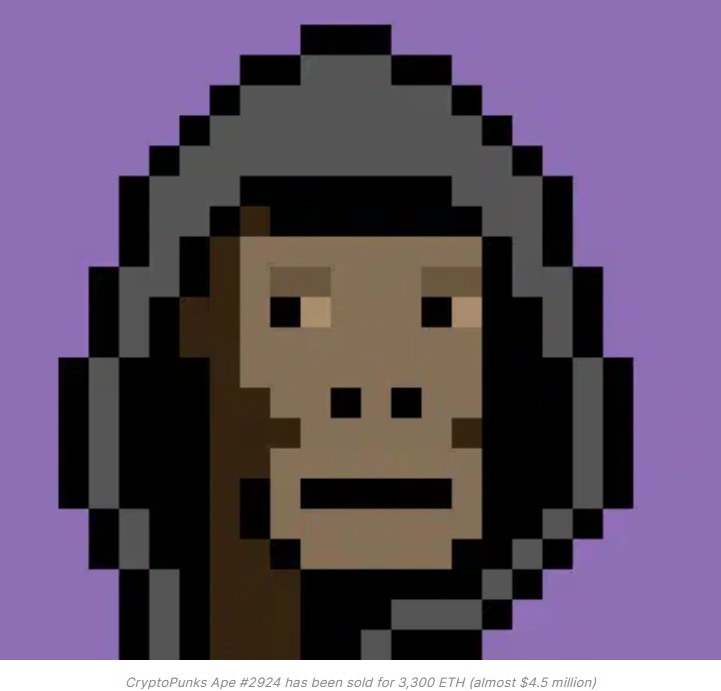 < 출처: https://nftevening.com/rare-ape-cryptopunk-sells-for-almost-4-5-million/ >